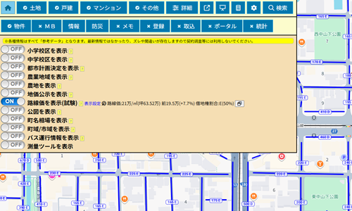「路線価を表示」ボタンをONにするだけで、全国の路線価を表示可能