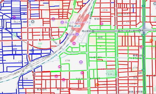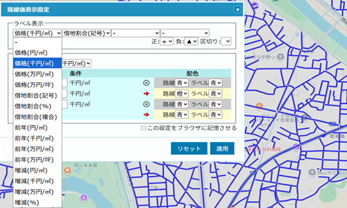 金額帯や増減率などの条件に応じて、道路ごとに自動で色分け表示が可能。